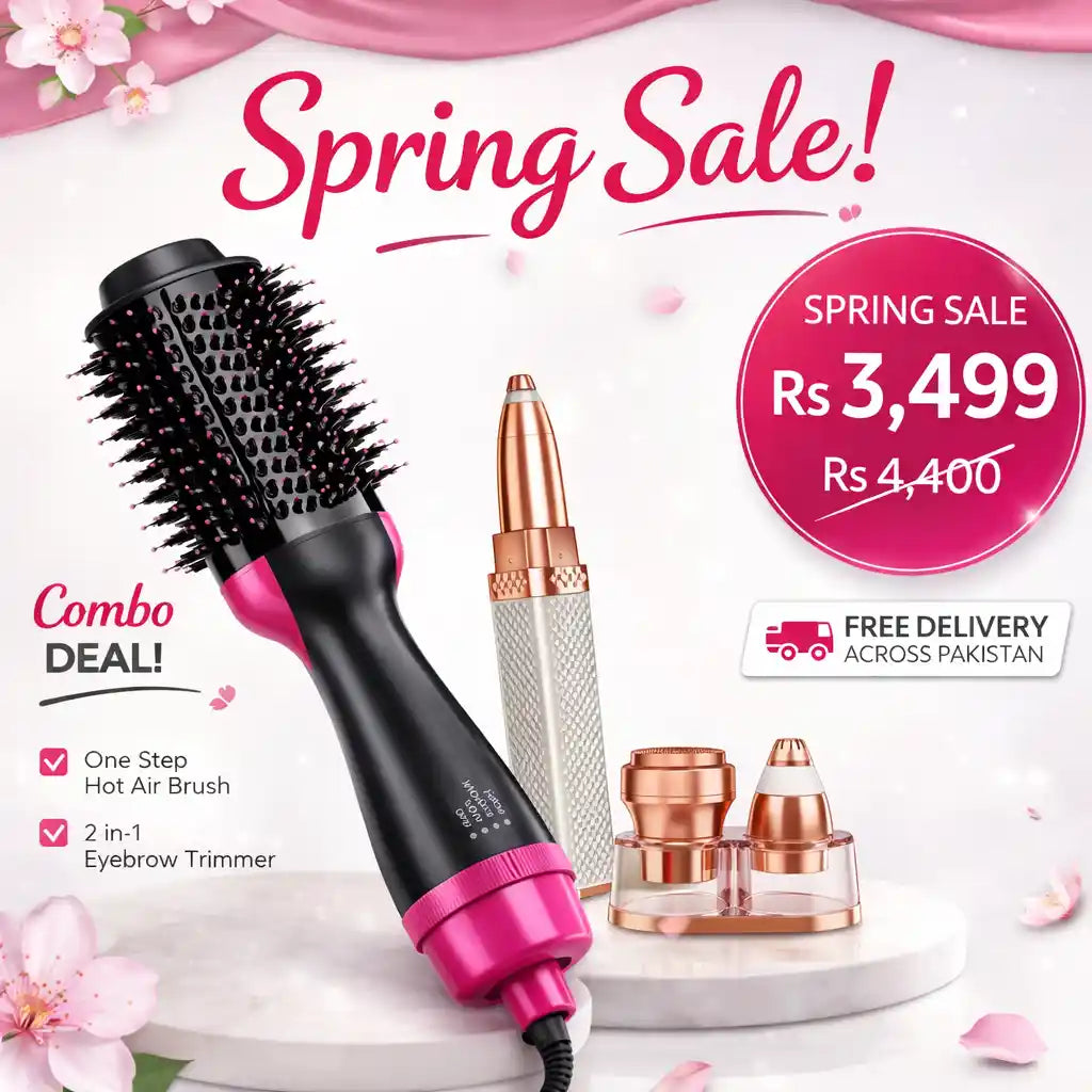 Get salon-style hair and flawless grooming at home with our One Step Hot Air Brush & 2-in-1 Eyebrow Trimmer Combo. Limited Spring Sale Rs 3,499 with Free Delivery Across Pakistan.